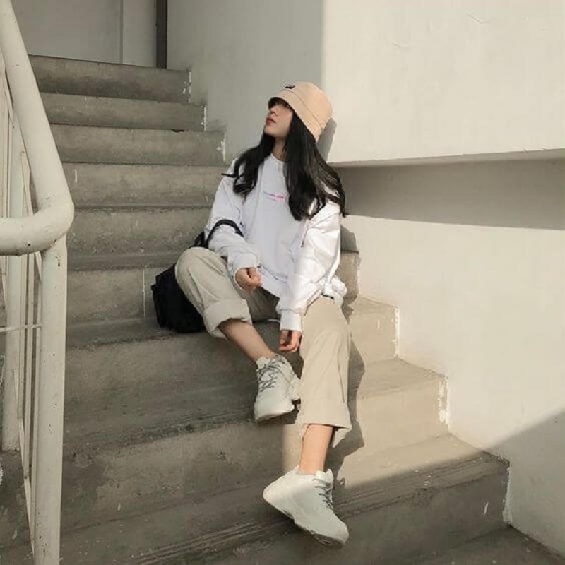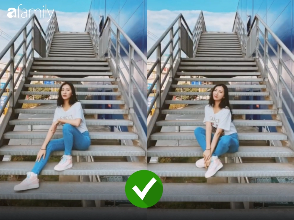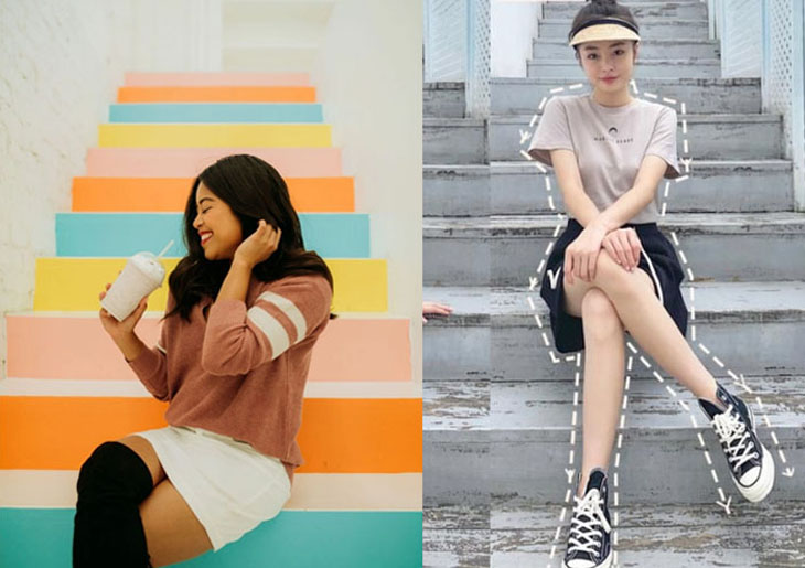 Cách tạo dáng này đơn giản, bạn ngồi lệch ⅔ sang một bên phía cầu thang. Một chân co và chân còn lại nhẹ nhàng duỗi hờ tạo cảm giác chân bạn dài hơn, đây cũng là mẹo hack chân được nhiều hotgirl áp dụng hiệu quả. Khi này tay của bạn đưa lên đầu như đang nhẹ nhàng vuốt tóc, hãy diễn thật tự nhiên để không gây sự “sượng trân” cho bức ảnh.